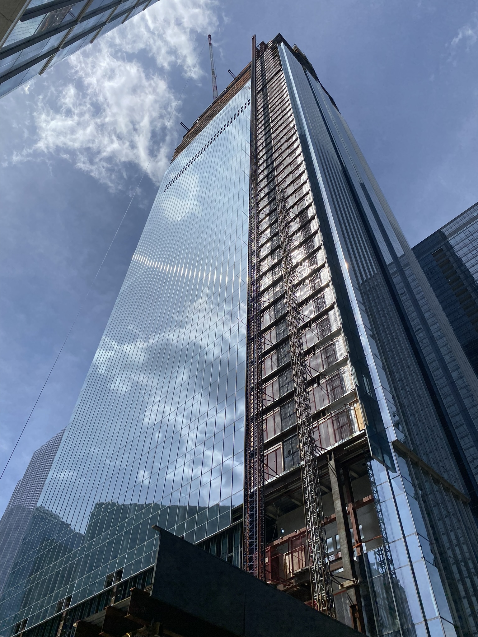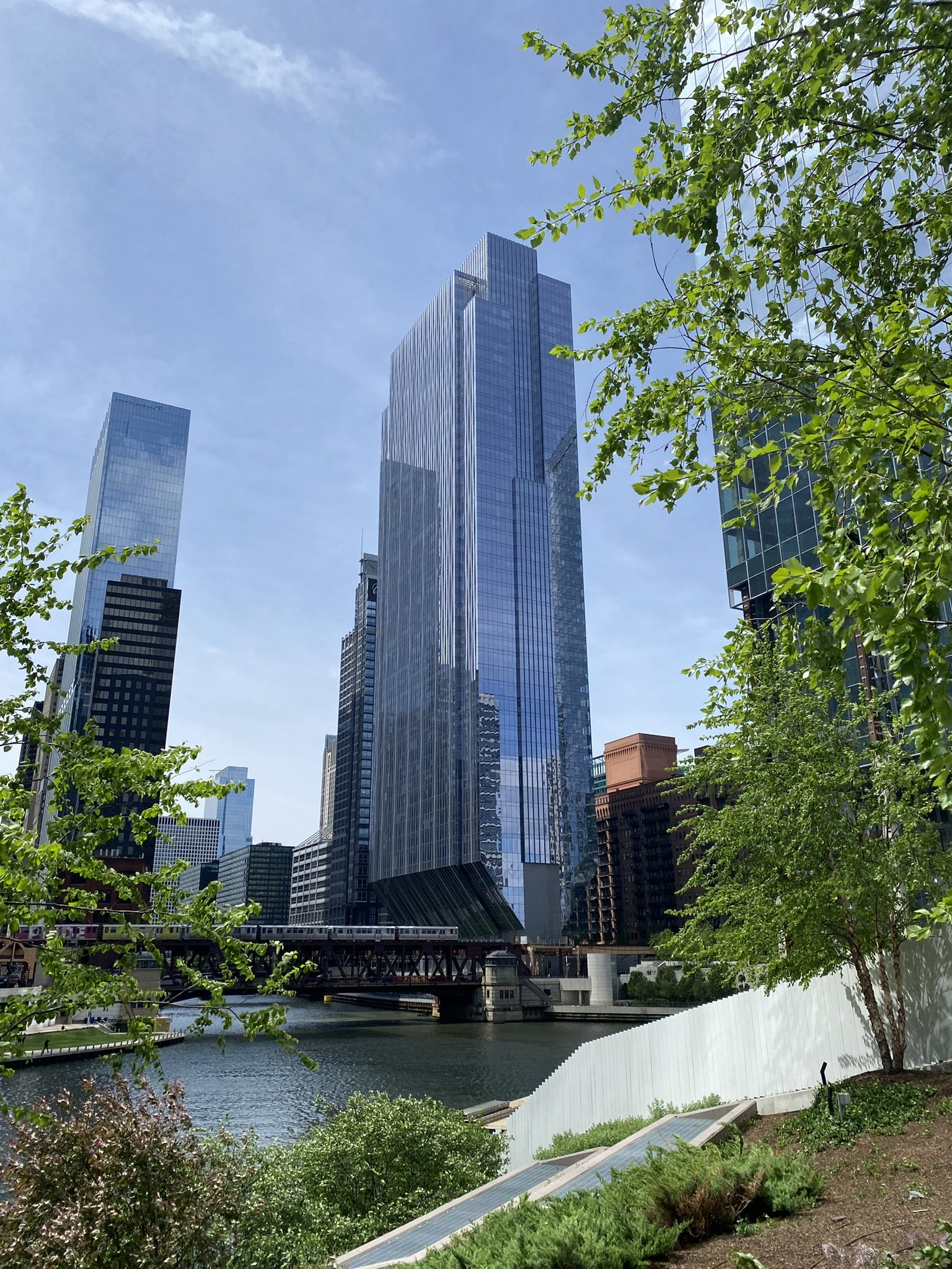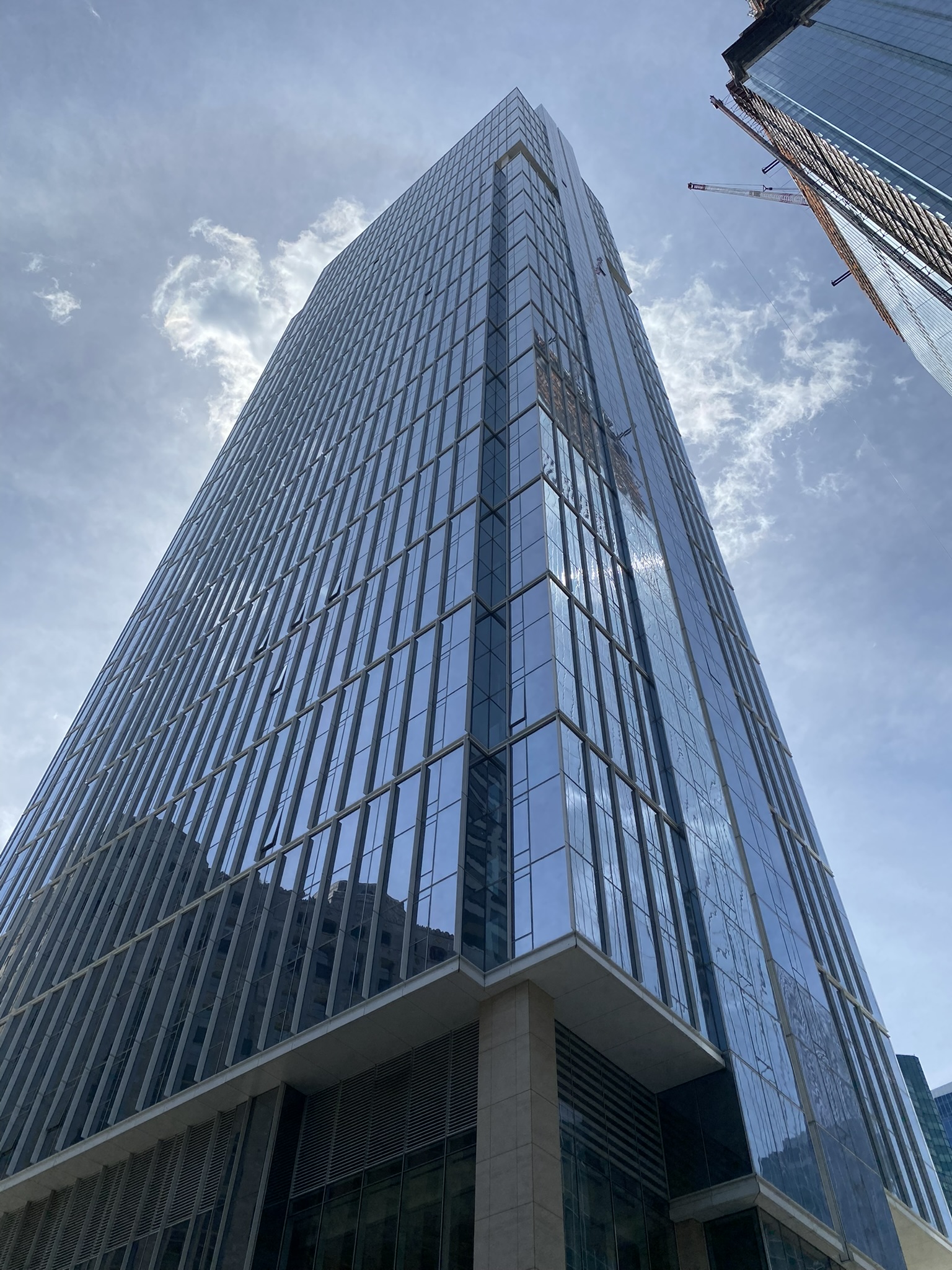 Right next to Wolf Point East, another project was awarded to CES called Wolf Point West which then became known as Sales Force Tower. This was to be an identical type of structure, except used for as an office building and although the number of floors were almost the same as the sister building, the floor to floor heights were increased on Sales Force Tower and the footprint was much larger. This massive façade truly creates a focus point on the Chicago River. The façade comprises approximately 568,000 square feet of custom unitized curtain wall, featuring varying depth vertical stainless steel covers. Additionally, a structural glass wall was installed at the podium level, enhancing the building’s transparency and connection to the surrounding environment. The curtain wall system was designed to accommodate the building’s sculptural form, characterized by a series of gently tapering setbacks that culminate in a distinctive crown. This design not only contributes to the tower’s aesthetic appeal but also aligns with its sustainability goals, as the building achieved LEED Gold certification. Our scope included the engineering design and creation of shop drawings for the building’s exterior curtain wall, ensuring the façade met both aesthetic and performance criteria. CES was retained to perform Design Assist and structural engineering for all of the exterior glazing systems.